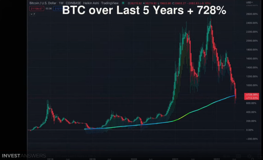 “A pesar de la aplastante caída de Bitcoin, [it] todavía ha subido un 728% durante ese período exacto de cinco años. Sí, este gráfico se ve muy feo y esa línea que ves es el promedio móvil de 200 semanas.
