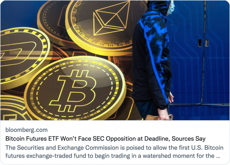 >Ocho horas más tarde, Bloomberg traslada un informe según el cual la SEC aprobará para su negociación tan pronto como la próxima semana al menos dos fondos cotizados (ETF) que planean invertir en futuros de activos digitales.
