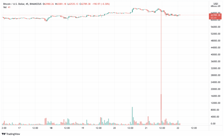 An>El bitcoin retrocedió desde sus máximos históricos para cotizar por debajo de los 63.000 dólares el viernes por la mañana en Asia, después de que los precios del bitcoin se desplomaran brevemente más de un 87% en la bolsa de criptodivisas de Binance en Estados Unidos.