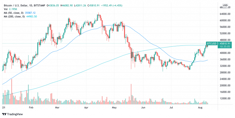 Gráfico>Bitcoin (BTC) se recuperó de las correcciones de los primeros días y volvió a cruzar por encima de su media móvil de 200 días el lunes 9 de agosto por la tarde. Este movimiento, que llevó a la criptodivisa más importante cerca de los 46.000 dólares, podría indicar una continuación del impulso alcista de las últimas dos semanas.