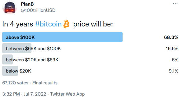 Plan B también encuesta a sus más de 1 millón de seguidores y les hace la pregunta: ¿Cuánto valdrá Bitcoin en cuatro años?