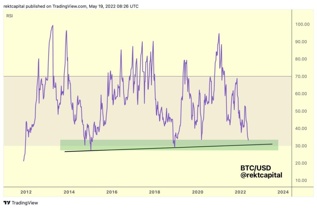 El comerciante seudónimo Rekt Capital les dice a sus 303,000 seguidores de Twitter que el índice de fuerza relativa (RSI) de BTC está alcanzando un nivel que históricamente indica que podría haber un rebote en el horizonte para el principal activo criptográfico por capitalización de mercado.
