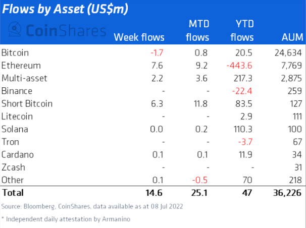 “Ethereum vio entradas por tercera semana consecutiva por un total de $ 7,6 millones. Las entradas sugieren un cambio modesto en el sentimiento después de haber soportado 11 semanas consecutivas de salidas que llevaron las salidas de 2022 a un máximo de $ 460 millones.