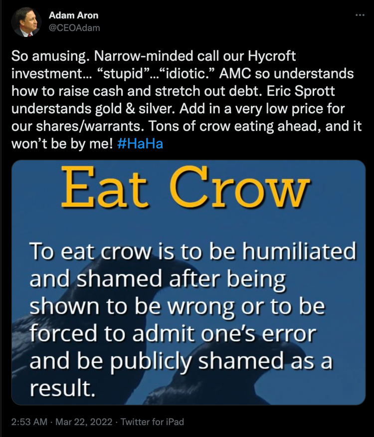 Durante la noche del martes, Aron de AMC tuiteó, «[n]a gente llama a nuestra inversión en Hycraft… ‘estúpida’… ‘idiota’. La semana pasada, AMC invirtió 28 millones de dólares (21 millones de libras esterlinas) en la mina de oro y plata Hycroft Mining Holding, con sede en Winnemucca (Nevada), un movimiento que provocó burlas tanto en los círculos tradicionales como en las redes sociales.