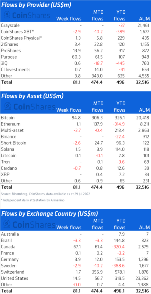 Casi USD 85 millones fluyeron hacia los productos de inversión de Bitcoin (BTC) la semana pasada, lo que elevó las entradas totales de los principales criptoactivos a USD 306,3 millones en julio y USD 326,1 millones en 2022.