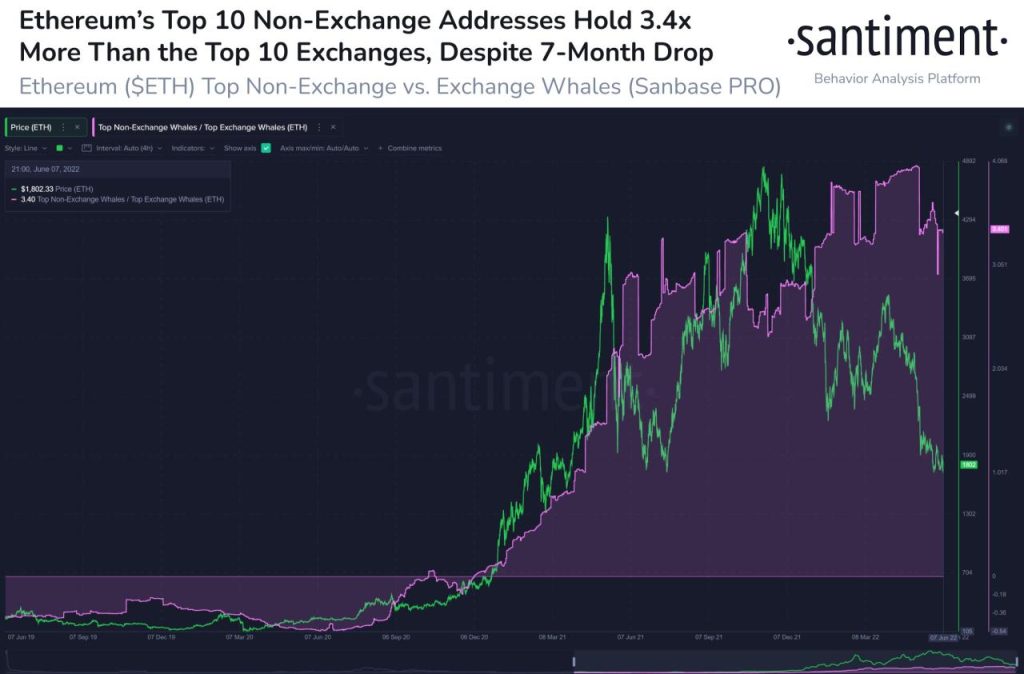 “Top 10 de Ethereum sin intercambio vs. Las direcciones de intercambio mantienen una alta proporción de ETH en propiedad sobre las 10 ballenas principales que no son de intercambio. Con 3,4 veces más monedas almacenadas, todavía parece existir la creencia de que los precios pueden estabilizarse».