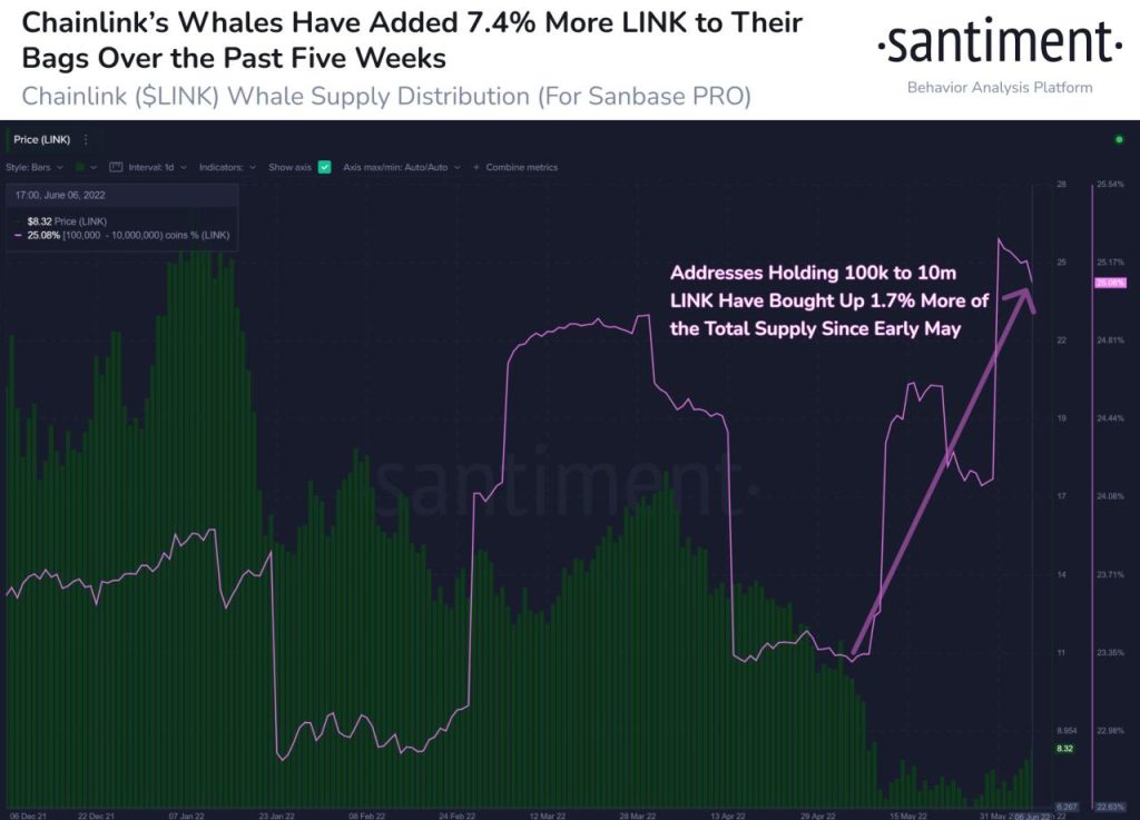 Santiment también dice que los inversores adinerados están acumulando Chainlink (LINK). La firma dice que las ballenas han estado almacenando el activo desde el mes pasado cuando el precio de la red Oracle descentralizada se desplomó a menos de $6.00.