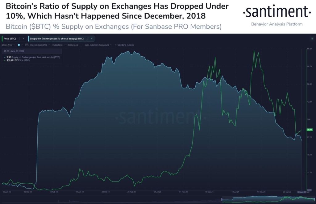 Santiment también revela que la proporción del suministro de Bitcoin en los intercambios ahora es del 10%, el más bajo desde diciembre de 2018, lo que podría ser una señal de una postura alcista entre los tenedores a largo plazo.
