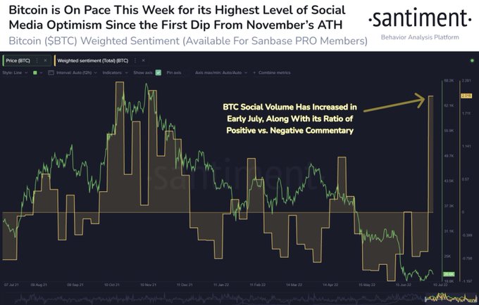 “El sentimiento social de Bitcoin está experimentando un nivel de optimismo sin precedentes esta semana a medida que nos acercamos a la segunda quincena de julio y la próxima reunión del Banco de la Reserva Federal. [interest rate] decisión. Una configuración ideal sería que la multitud se mantuviera escéptica mientras los precios suben con poca resistencia”.