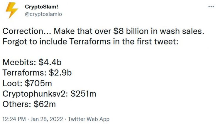 La empresa de datos de NFT CryptoSlam ha eliminado recientemente 8.000 millones de dólares en operaciones de lavado de sus cifras de volumen de ventas de NFT para la plataforma de NFT LooksRare, que se lanzó el mes pasado.
