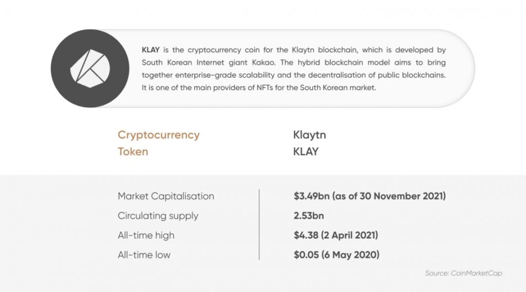 KLAY es la criptomoneda de la cadena de bloques Klaytn, desarrollada por el gigante surcoreano de Internet Kakao. El modelo de blockchain híbrido pretende aunar la escalabilidad de grado empresarial y la descentralización de las blockchains públicas. Es uno de los principales proveedores de NFT para el mercado surcoreano.