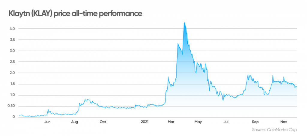 KLAY, el token nativo de la blockchain de Klaytn, se lanzó a finales de marzo de 2020. A diferencia de muchas otras monedas, KLAY no sufrió una subida de precios inmediata seguida de una caída cuando se lanzó. El precio comenzó en 0,09194 dólares y cotizó entre 0,06 y 0,09 dólares, subió hasta 0,30 dólares el 8 de junio de 2020, antes de bajar a 0,17 dólares.