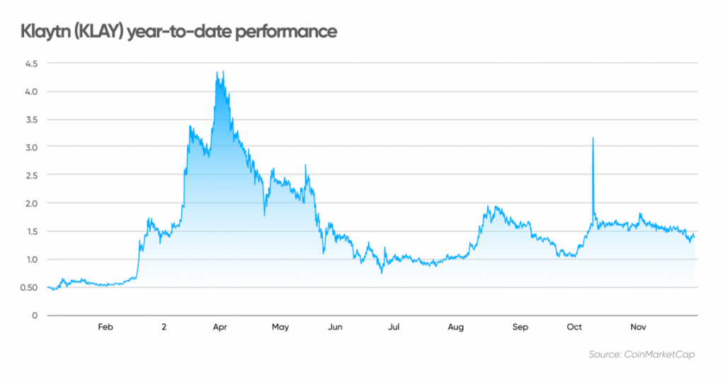Klaytn>El token KLAY para la blockchain Klaytn ha retrocedido en su precio después de subir a principios de noviembre.