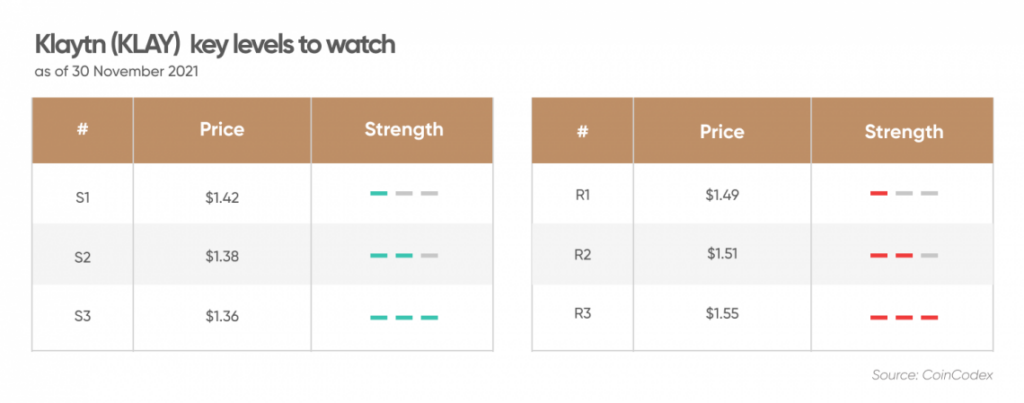 En el momento de escribir este artículo, el 30 de noviembre, KLAY cotizaba a 1,41 dólares, tras haber atravesado el soporte técnico de 1,42 dólares. Había más soporte en 1,38 y 1,36 dólares, mientras que la resistencia estaba en 1,49, 1,51 y 1,55 dólares. CoinCodex predice que el precio de KLAY se mantendrá relativamente estable en los próximos días, cotizando a 1,41 dólares el 5 de diciembre.