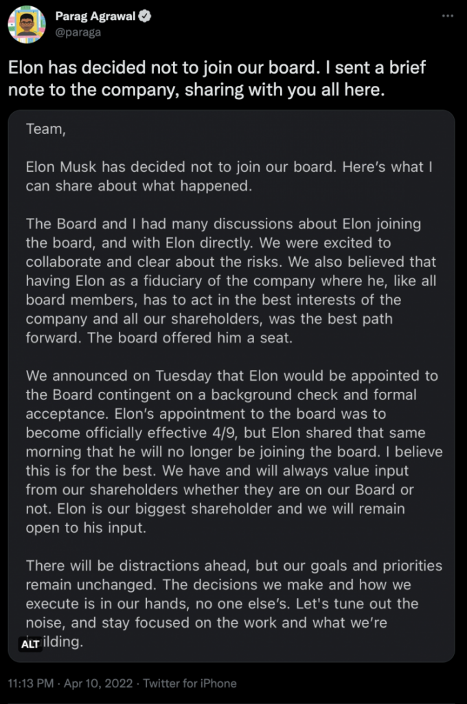 Justo después de las 11 de la noche EST (UTC -5), el CEO de Twitter, Parag Agrawal, dijo a través de la plataforma, «Elon ha decidido no unirse a nuestra junta.» Esto siguió a un fin de semana de cierta actividad de cejas de Musk en Twitter, durante el cual sugirió la transformación de Twitter de una empresa apoyada por la publicidad a, al menos, un servicio parcialmente basado en la suscripción, y a convertir la sede de la oficina de Twitter en San Francisco en un refugio para personas sin hogar.
