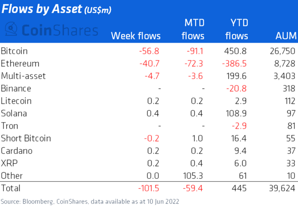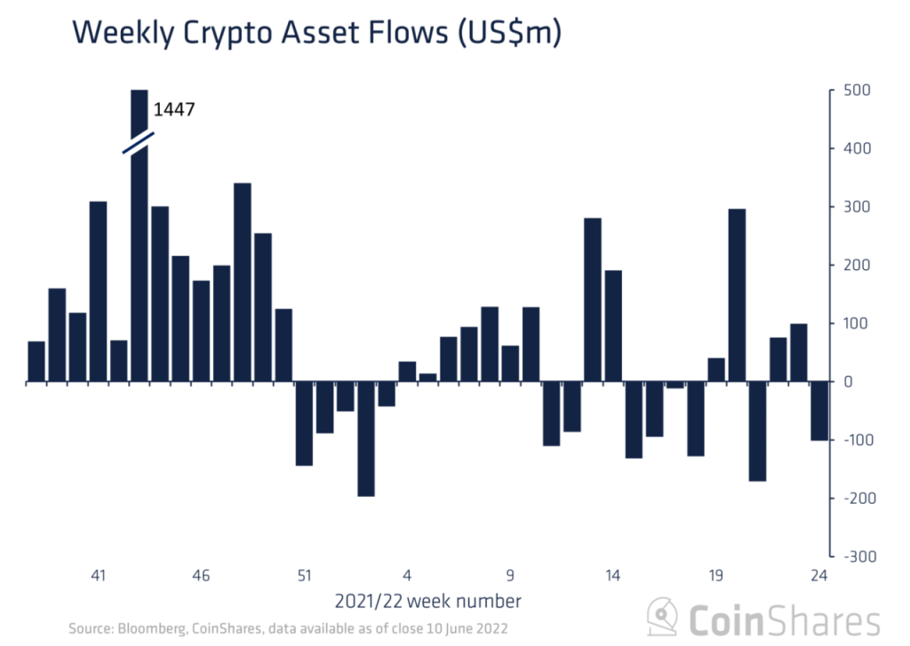 “Los flujos de productos de inversión en activos digitales siguen siendo irregulares en previsión de una política monetaria agresiva, con salidas diarias constantes la semana pasada por un total de US $ 102 millones. Lo que ha llevado a Bitcoin a un «invierno criptográfico» en los últimos 6 meses puede explicarse en gran medida como resultado directo de una retórica cada vez más agresiva de la Reserva Federal de EE. UU.