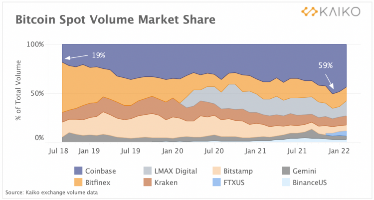 «Podemos observar que la cuota de mercado de Coinbase’ alcanzó recientemente un máximo histórico de casi el 60% en diciembre, antes de retroceder al 51% en enero. El pico se debió a la fuerte actividad comercial en los mercados BTC-USD de Coinbase durante la venta de Omicron y la temporada de vacaciones de bajo volumen,» escribe Medalie.
