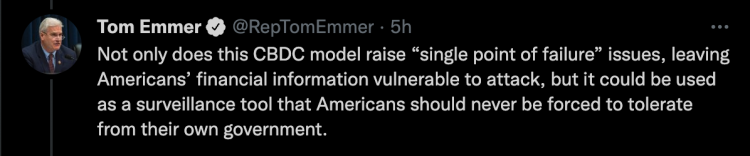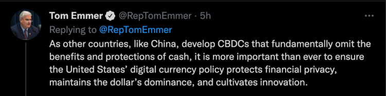 «Exigir a los usuarios que abran una cuenta en la Fed para acceder a un CBDC de Estados Unidos pondría a la Fed en un camino insidioso similar al autoritarismo digital de China,» dijo Emmer en un hilo de Twitter que acompañaba a la noticia.