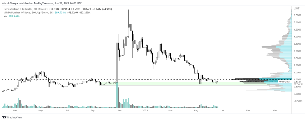 Otro criptoactivo en el que Altcoin Sherpa es optimista es Decentraland (MANA). El analista dice que la plataforma de realidad virtual se recuperará después de tocar fondo. MANA ahora se cotiza a $ 0,90 desde un mínimo de $ 0,74 en junio.