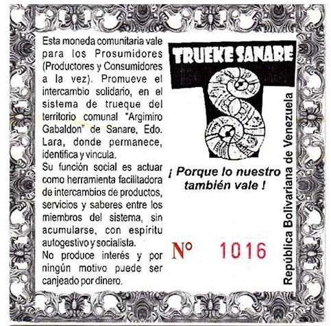 Esta moneda comunitaria vale para los Prosumidores (Productores y Consumidores a la vez). Promueve el intercambio solidario, en el sistema de trueque del territorio comunal “Argimiro Gabaldon” de Sanare, Edo. Lara, donde permanece, identifica y vincula.