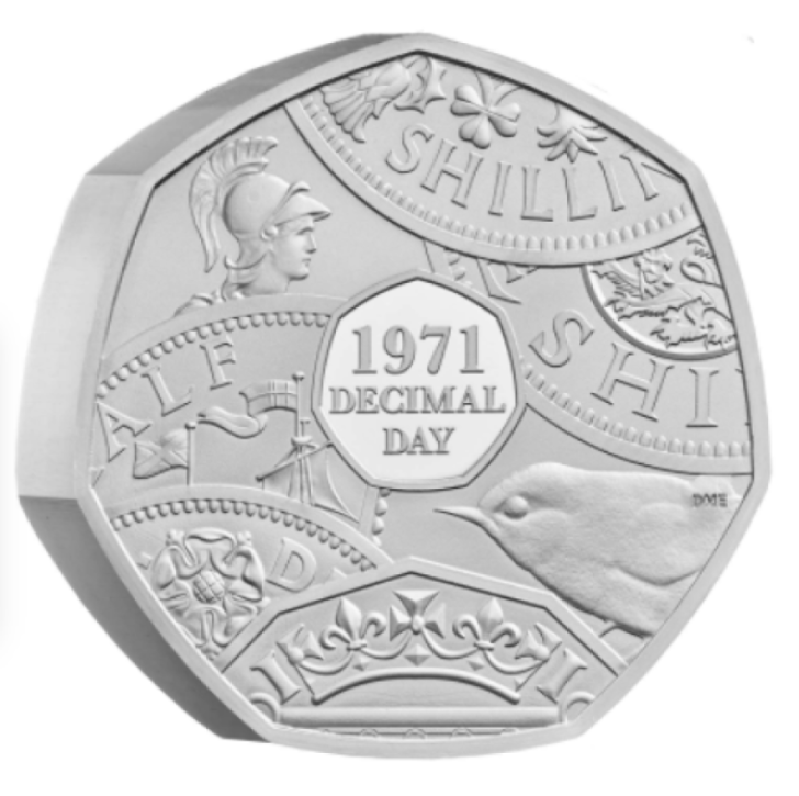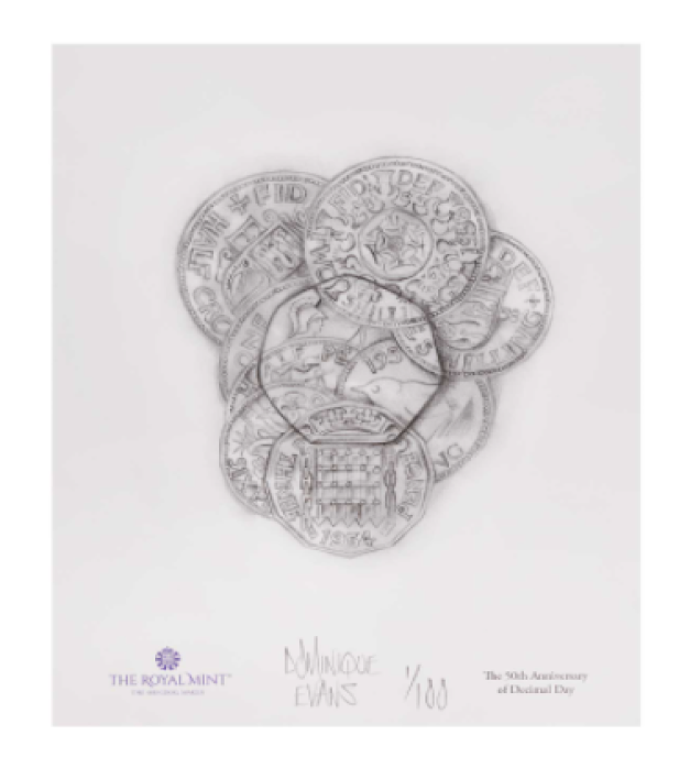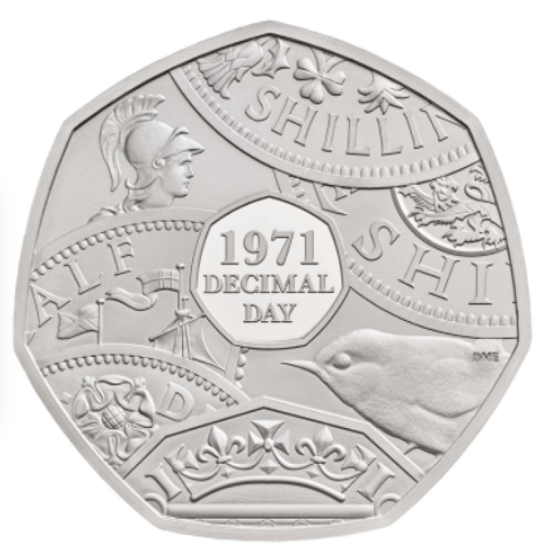 La moneda de 50 peniques acuñada para celebrar el 50º aniversario de la decimalización presenta un diseño del reverso realizado por Dominique Evans. Dominique es un diseñador senior de The Royal Mint y el creador de algunos de los diseños de monedas más conocidos y admirados de los últimos años.