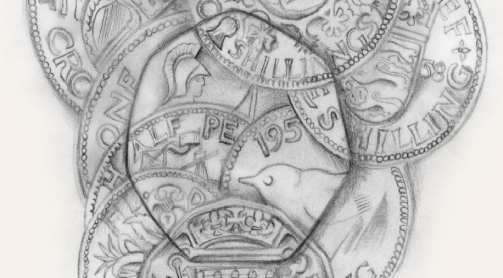 El dulce reyezuelo asoma de la corona de un tres peniques, junto a la rosa del seis peniques y al lado de la emblemática Britannia. Todas las monedas están representadas en su tamaño real, para que las personas que las usaron las recuerden con cariño y para que las nuevas generaciones las entiendan.