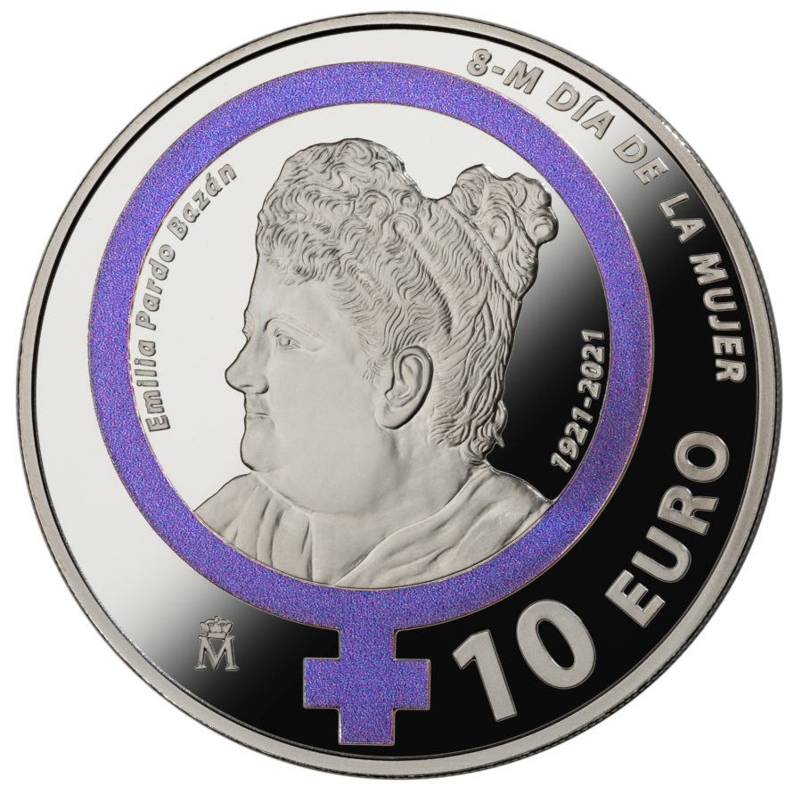 En el reverso, en el centro de la moneda, está grabado el símbolo de la mujer y en su interior un retrato de la escritora fechado el 8 de septiembre de 1892. Al lado figuran las menciones «EMILIA PARDO BAZÁN» y «1921-2021». En la parte superior derecha está escrita la leyenda «8-M DÍA DE LA MUJER».