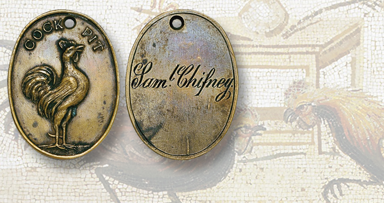 Pero los registros de las peleas de gallos, combates entre dos gallos de pelea, a menudo armados, se remontan al menos a hace 6.000 años. Las peleas de gallos eran un deporte reconocido en la sociedad inglesa de la década de 1700, lo que dio lugar a la creación de interesantes piezas numismáticas, cinco de las cuales se ofrecieron en la subasta nº 54 de Baldwins de St.