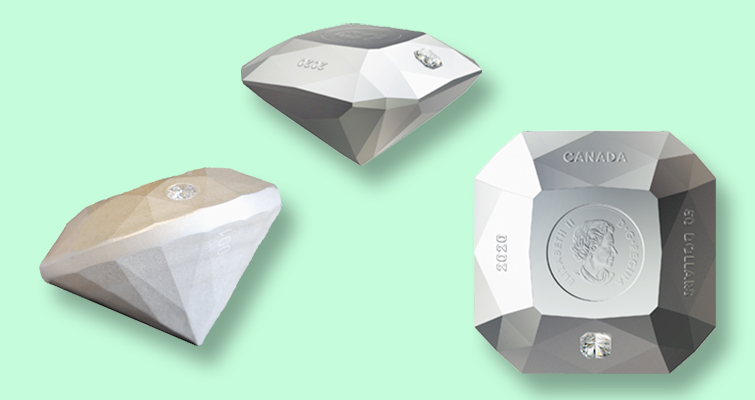 La moneda de 50 dólares de plata fina Matte Proof .9999 tiene forma de diamante y agotó rápidamente su límite de acuñación de 700 ejemplares a pesar de contener «sólo» 3 onzas de plata (92,5 gramos, en realidad) y un pequeño diamante, y de tener un precio de 1.499,95 dólares canadienses (unos 1.089 dólares estadounidenses).