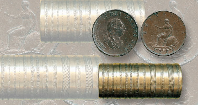 El lote incluía 24 guineas de latón de imitación de Jorge III y tres monedas auténticas de Jorge III y Jorge IV dentro de una caja de cobre que se asemeja a una pila de medios peniques de 1799, con dos medios peniques utilizados como tapa y base.