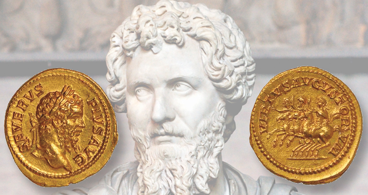 Un aureus de oro de entre 202 y 210 d.C. emitido por el gobernante recuerda las medidas que tomó para evitar que sus hijos Caracalla y Geta se pelearan. Los muchachos estaban entonces probablemente en la mitad o el final de su adolescencia. La moneda destaca en la subasta de Baldwin of St. Jamess en Nueva York el 14 de enero.