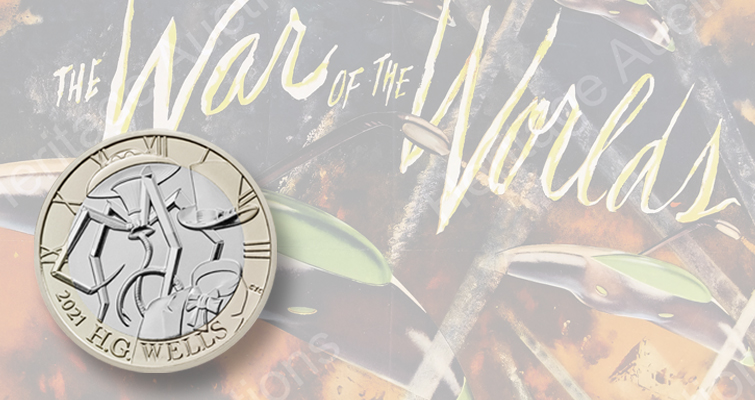 El artista estadounidense Chris Costello diseñó la moneda, que la Real Casa de la Moneda desveló el 4 de enero como parte de su conjunto de cinco diseños conmemorativos para 2021. Su diseño muestra un trípode de cuatro patas, la máquina de combate utilizada por los marcianos en el clásico de Wells de 1898 La guerra de los mundos .