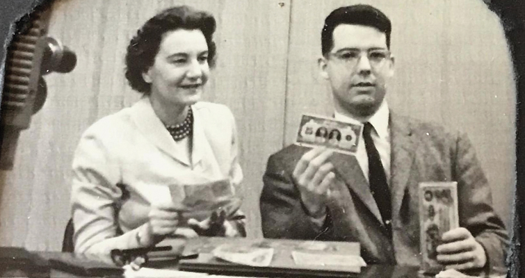 El Dr. Harold Don Allen, a la derecha, utilizó programas educativos, incluida la televisión, para promover la numismática. Imagen por cortesía de la familia Allen