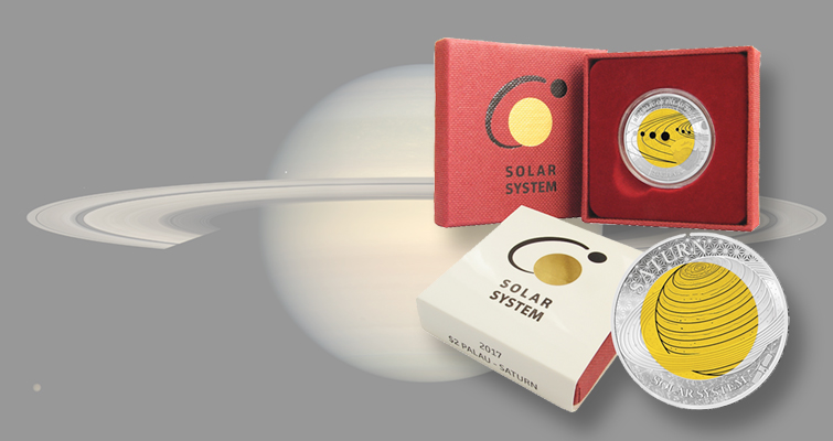El sexto planeta desde el sol es el primer tema de una serie de monedas anilladas de plata y niobio del Sistema Solar que se planea emitir durante ocho años desde Palau.