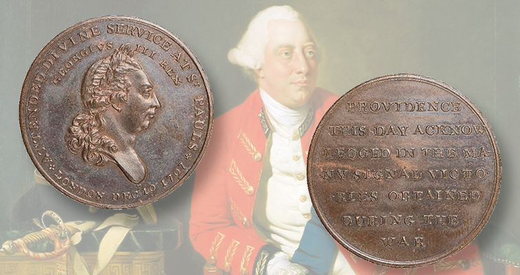 Una ficha «Conder» de 1797 conmemora la asistencia del rey Jorge III a una celebración en la catedral de San Pablo. Imágenes por cortesía de Baldwins of St. Jamess.