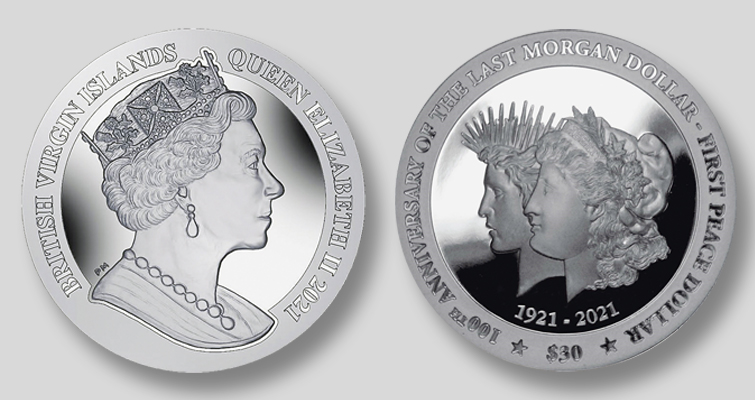 La moneda de 30 dólares de 2021, emitida para las Islas Vírgenes Británicas, marca el centenario de la transición del dólar Morgan al dólar Peace, para «conmemorar esta significativa evolución de la libertad americana,» según Pobjoy.