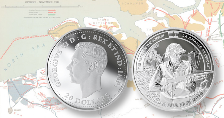 Una moneda Proof 2019 de plata .999 fina de 20 dólares es la más reciente de la serie Battlefront de la RCM. Conmemora la batalla del Escalda.