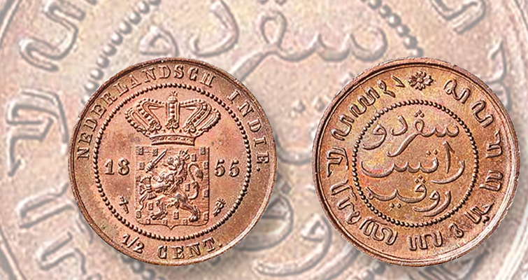 Una huelga de prueba de medio centavo de 1855 para las Indias Orientales Holandesas fue rechazada por un error ortográfico. El ejemplo se vendió en una subasta del 4 de noviembre en Ámsterdam por un precio de martillo de 3.600 euros (4.189 dólares estadounidenses).