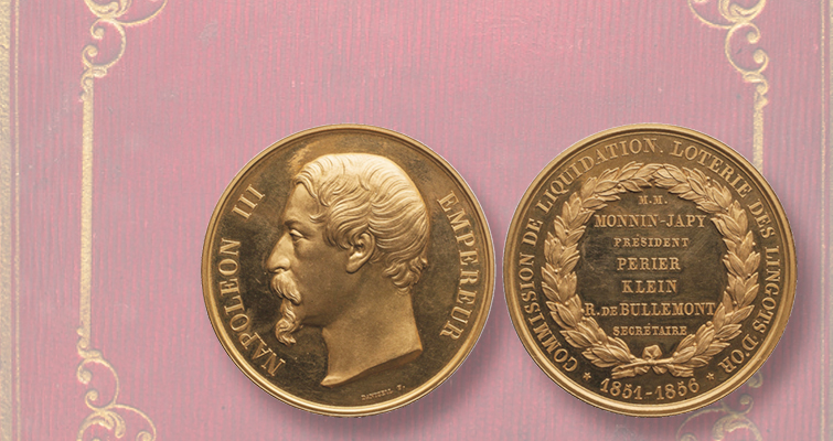 Una medalla de oro de Napoleón III fue emitida por una organización francesa que patrocinó a colonos franceses en la fiebre del oro de California en la década de 1850. MDC Monnaies de Collection Monaco ofrecerá la gran medalla de oro en una subasta el 20 de mayo.