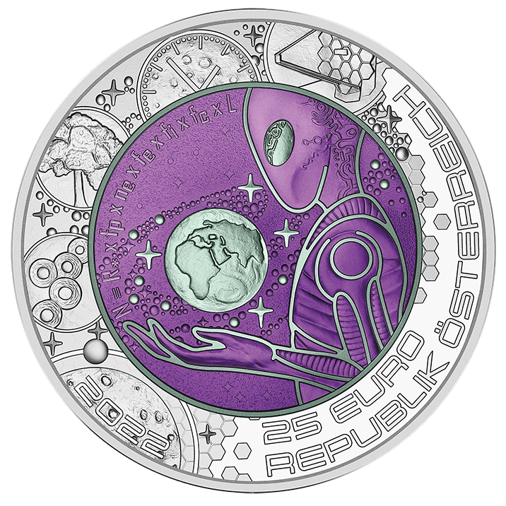El Webb está representado en el anillo plateado exterior del anverso de la moneda junto a la famosa ecuación de Drake, que pretende calcular la probabilidad de vida extraterrestre.