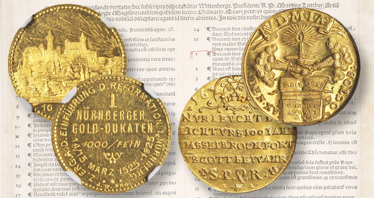 Un par de piezas de oro, una moneda y una medalla, que celebran aniversarios dispares de la Reforma Protestante se ofrecen durante la subasta del 21 de agosto de Stacks Bowers Galleries.