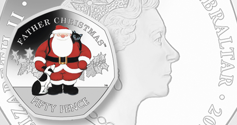 Las monedas de Pobjoy llevan una ilustración del libro de Raymond Briggs de Papá Noel con su perro a los pies y su gato sentado en el hombro. Las inscripciones dicen PADRE NAVIDAD arriba y CINCUENTA PENSOS debajo de Papá Noel y sus mascotas.