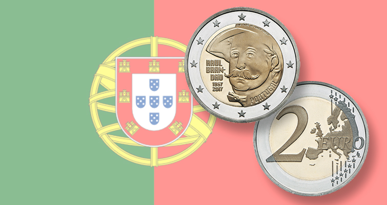 Portugal rinde homenaje al escritor Raul Brandão en una nueva moneda circulante conmemorativa de 2 euros (mostrada), con una versión Proof también disponible.