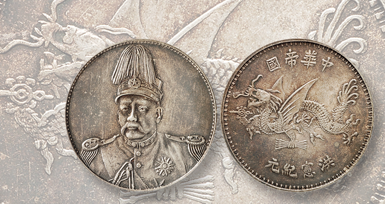 Según Bruce Smith, autor del catálogo de la casa de subastas, «Hay dos explicaciones diferentes para el Dólar de Plata del Dragón Volador de Yuan Shih Kai, supuestamente acuñado en 1916 para marcar la entronización de Yuan Shih Kai como Emperador Hung Hsien.»
