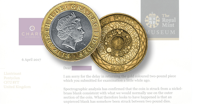 El 6 de abril de 2017, Barker volvió a escribir para verificar que la moneda de 2 libras esterlinas de 2007 era efectivamente un error de acuñación. Se había acuñado un cospel de níquel-latón sin perforar entre los dos troqueles de la moneda de 2 libras de tecnología de 2007. En un correo electrónico, se mencionó que Barker sólo había visto cuatro o cinco monedas similares, pero nunca una moneda de 2 libras de este tipo durante su tiempo en la Royal Mint.