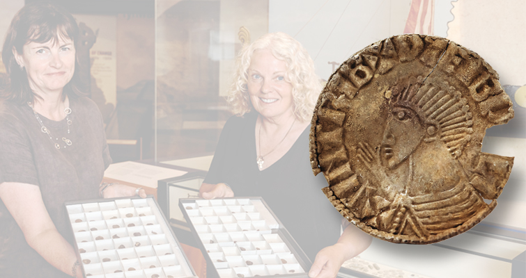 Allison Fox, conservadora de arqueología del Patrimonio Nacional de Manx, a la izquierda, aparece con la detectora de metales Kath Giles, que encontró el tesoro que incluía una representación del rey Sihtric Silkbeard, rey nórdico de Dublín de hace 1.000 años.