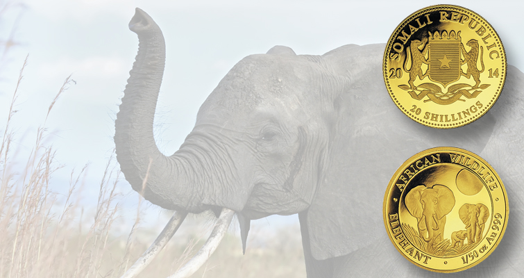Emporium Hamburgo ha anunciado que ha emitido por error una moneda de peso insuficiente en su programa de Elefantes de Somalia de 2014. A la moneda le faltan 0,12 gramos de oro, una diferencia de unos 7 dólares al valor actual del mercado. Imágenes por cortesía de Emporium Hamburg.